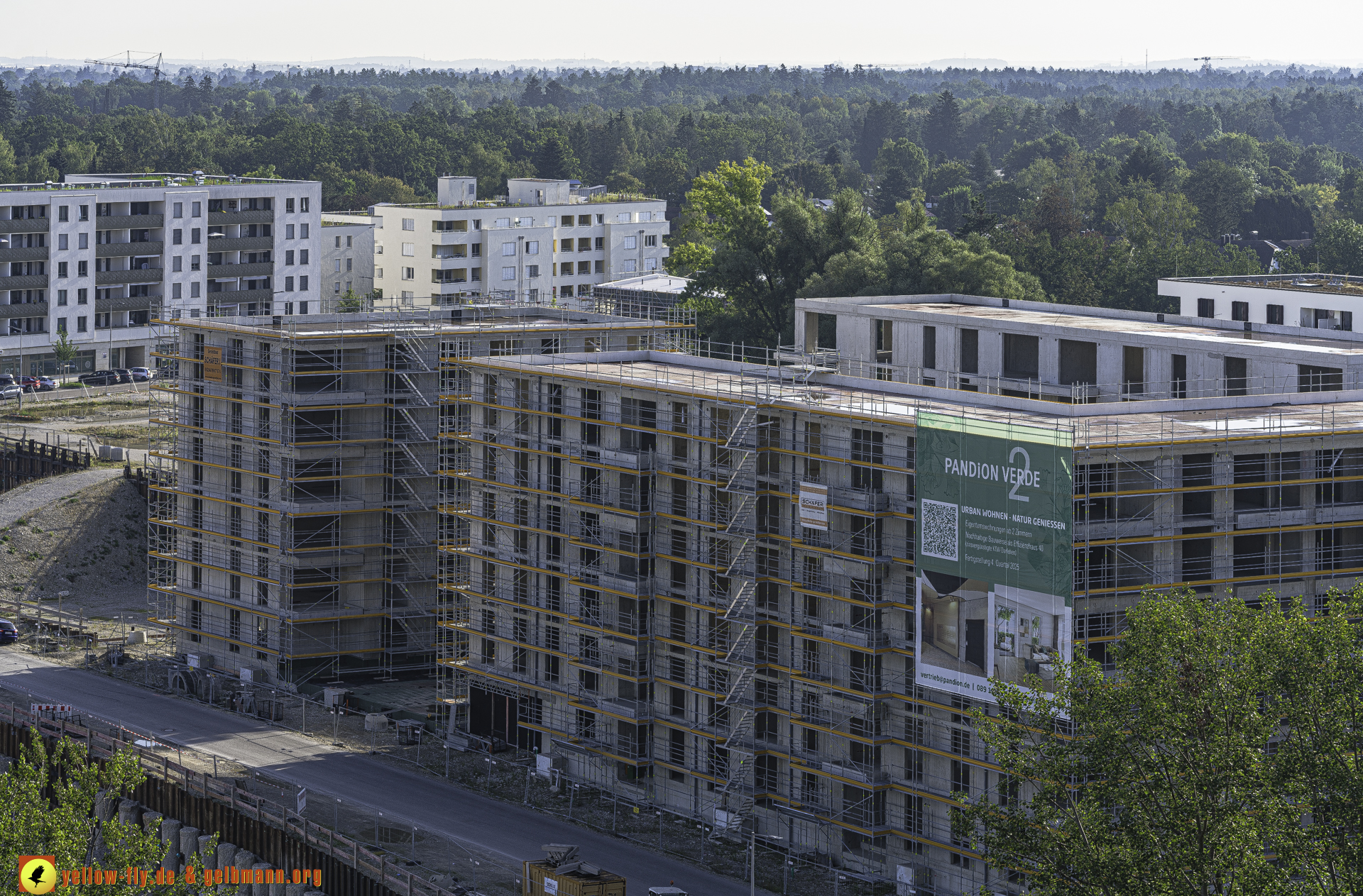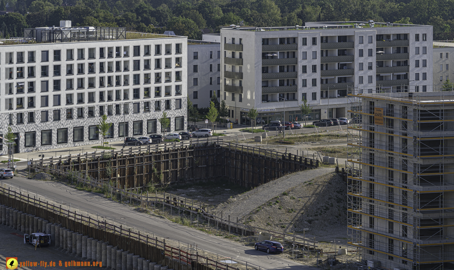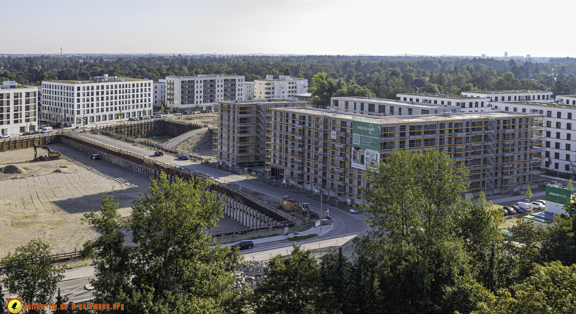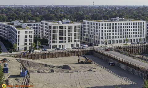 Auf dem 1. Blick ist nichts Neues zu sehen. An einigen Gebäuden von Pandion Verde sind allerdings weitere Gerüstteile zu sehen. In der großen Baugrube, in der mal ein Hochhaus mit 54 Metern geplant war, oder noch ist, kann man ein Auto mit einer Messstange sehen. Mehr ist nicht.