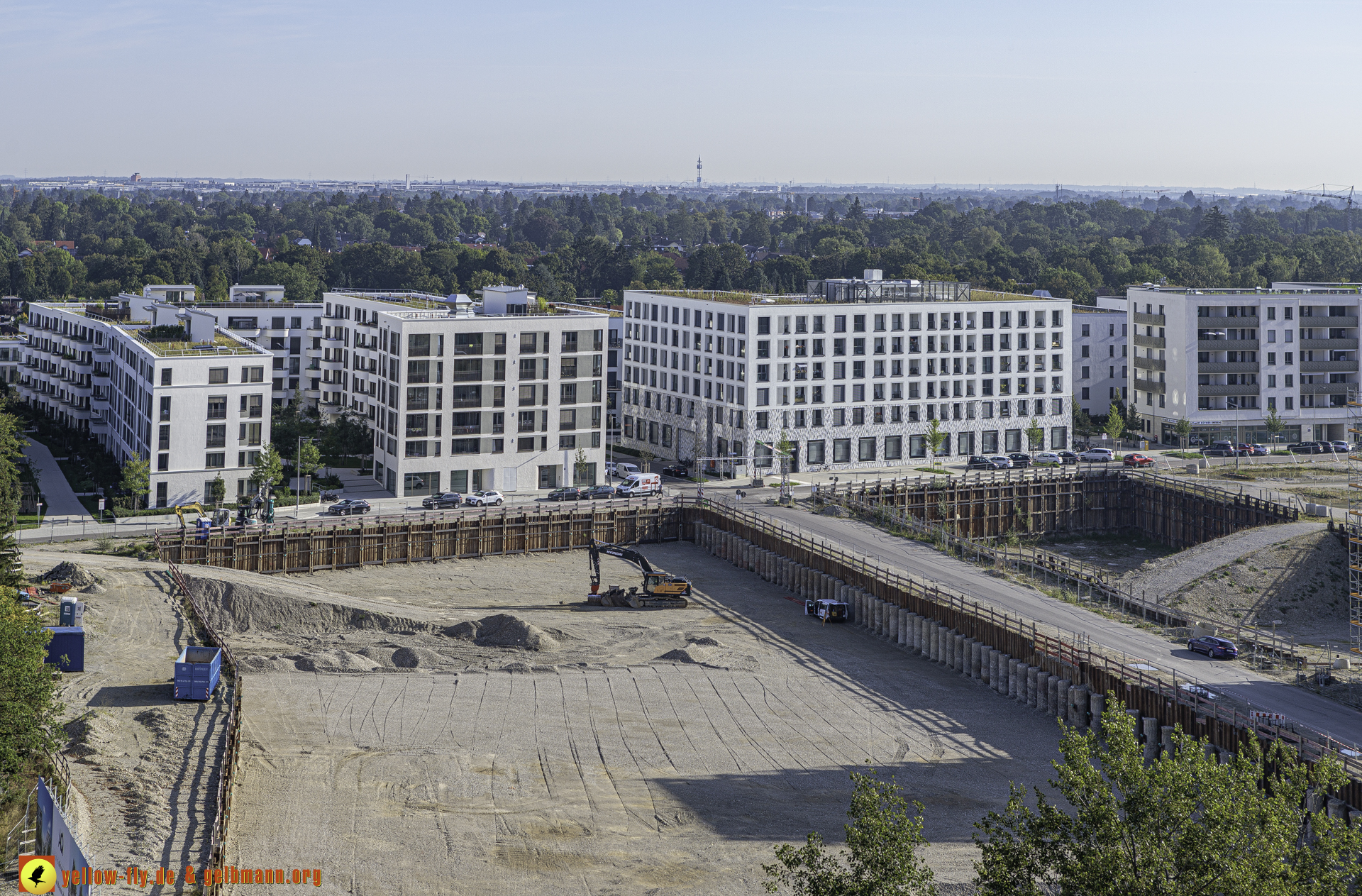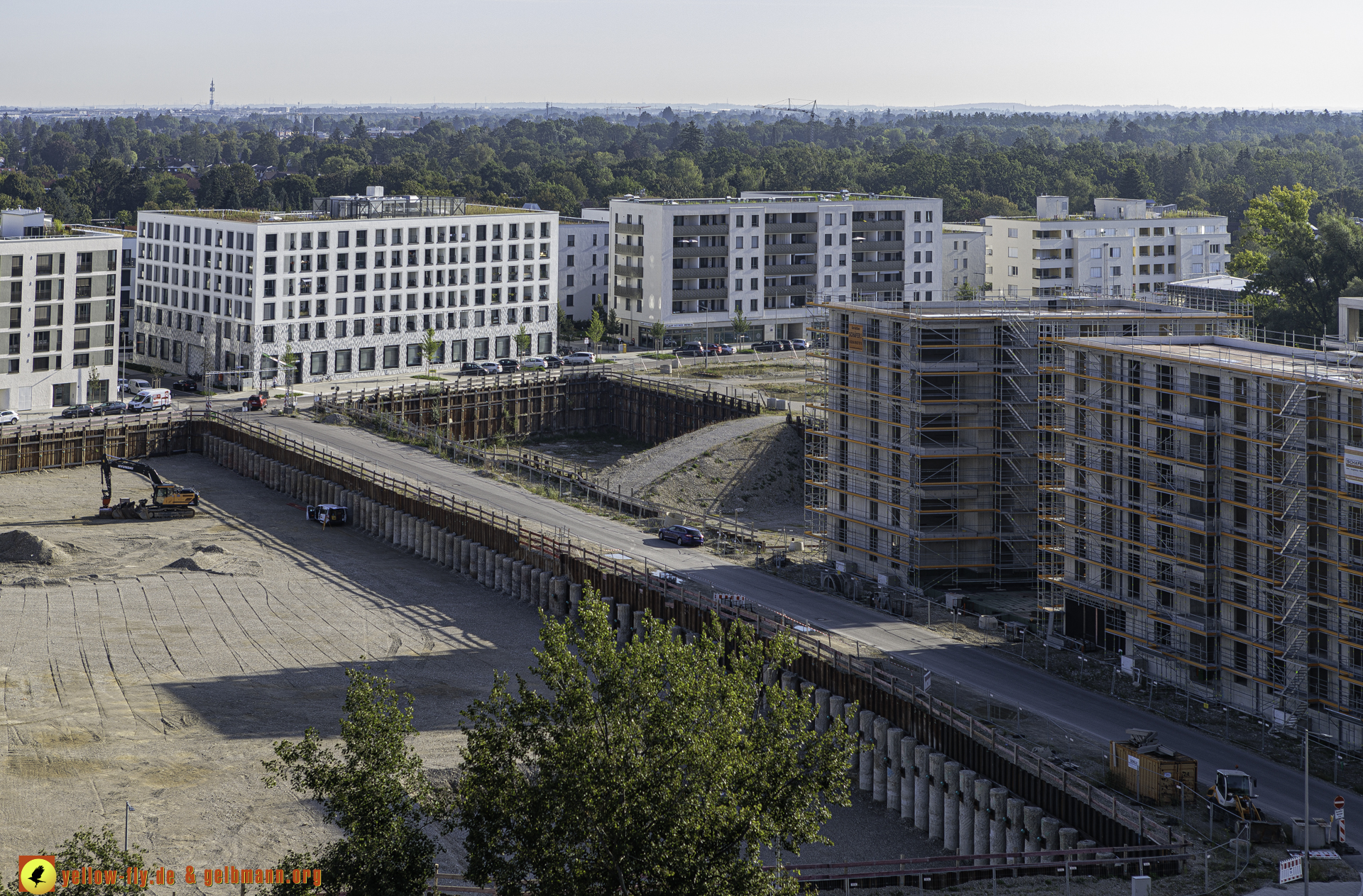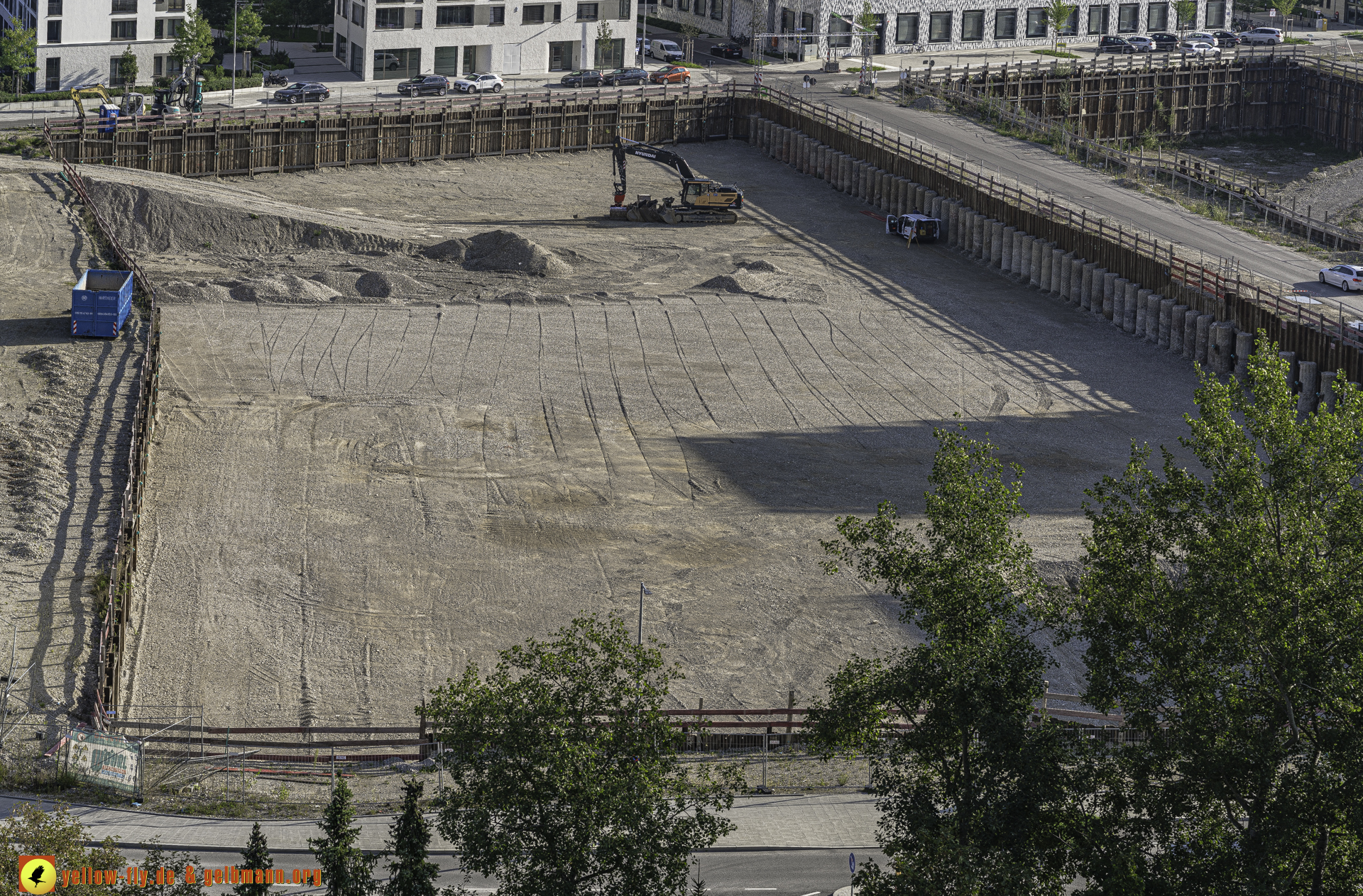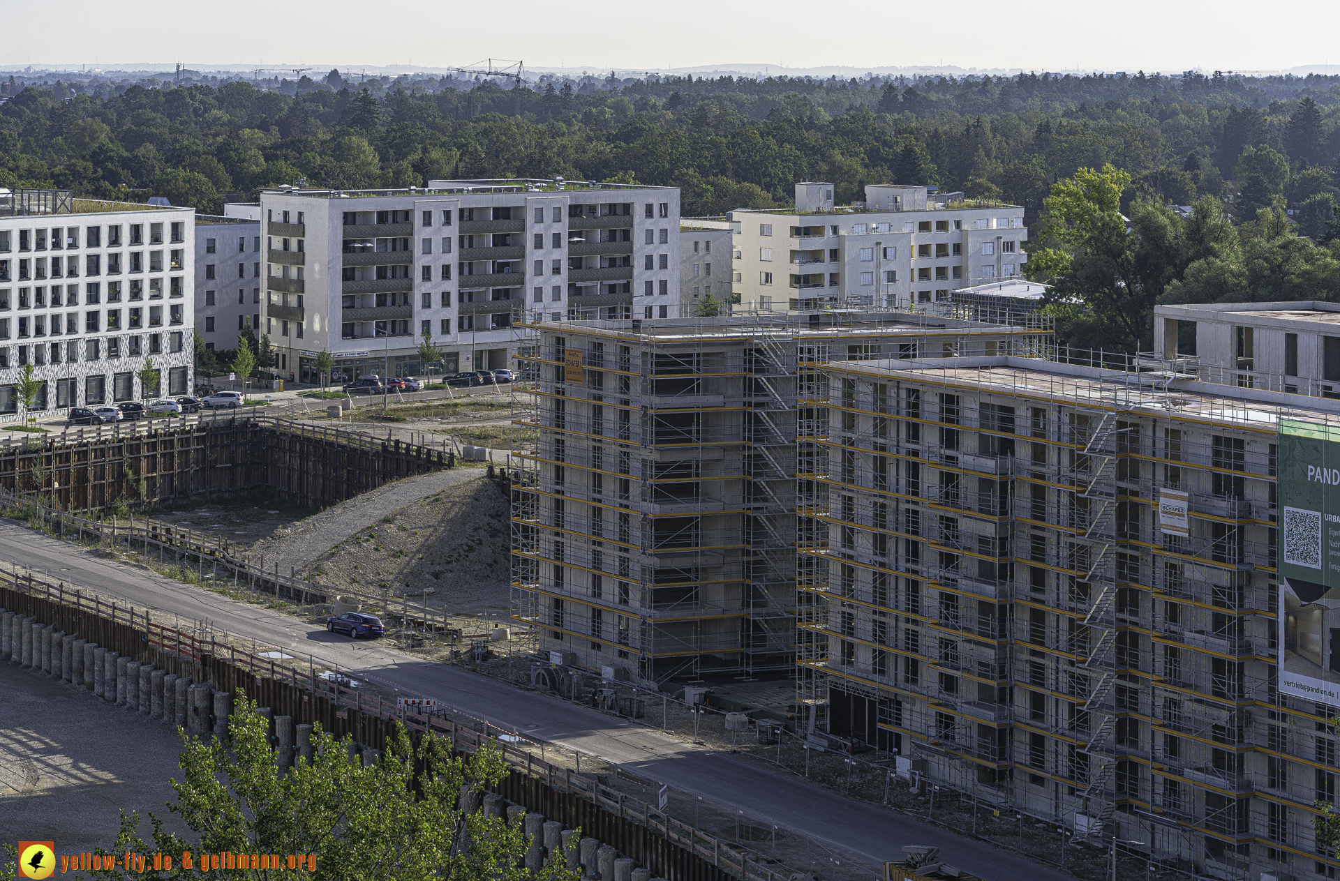 Auf dem 1. Blick ist nichts Neues zu sehen. An einigen Gebäuden von Pandion Verde sind allerdings weitere Gerüstteile zu sehen. In der großen Baugrube, in der mal ein Hochhaus mit 54 Metern geplant war, oder noch ist, kann man ein Auto mit einer Messstange sehen. Mehr ist nicht.