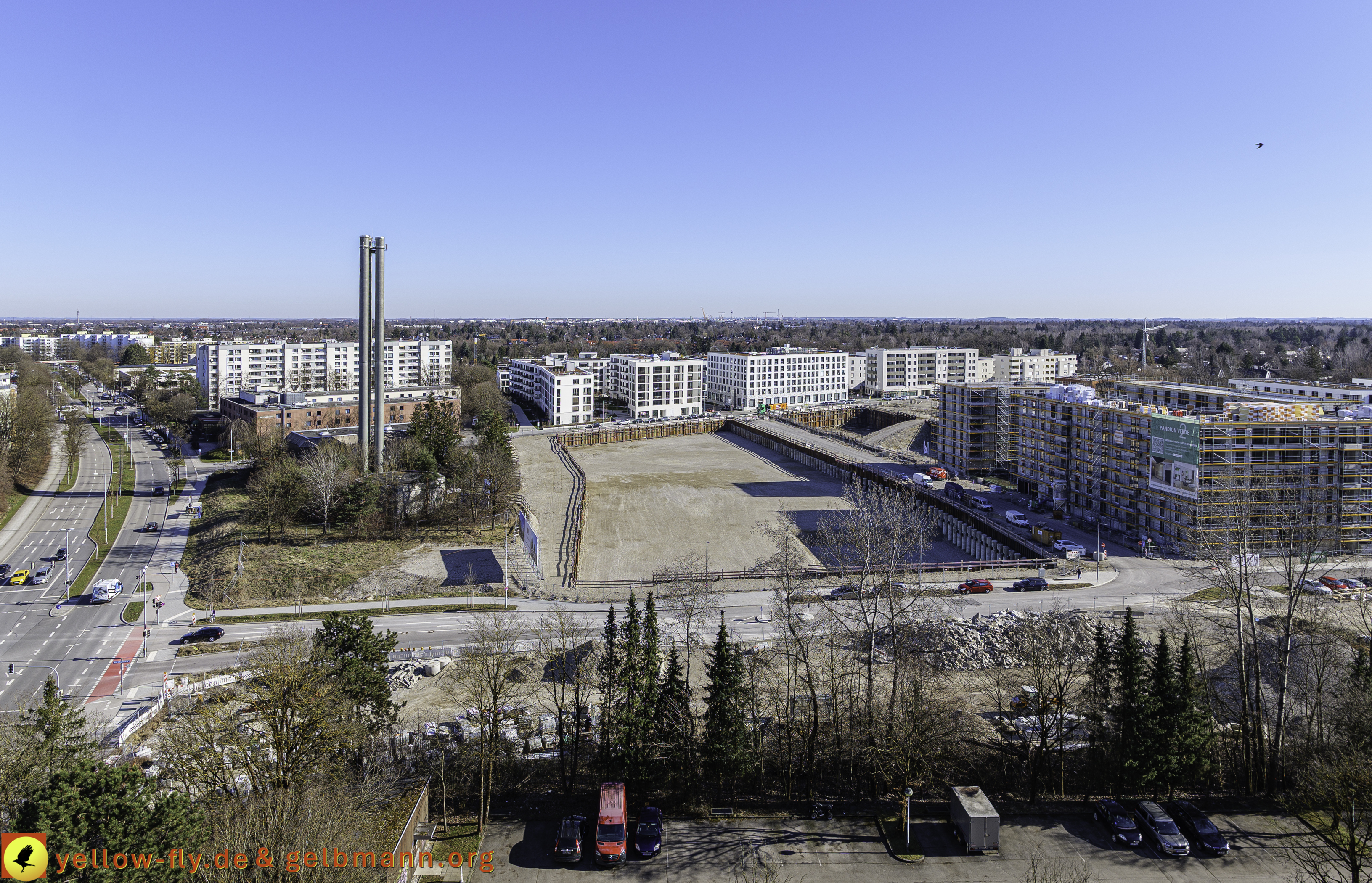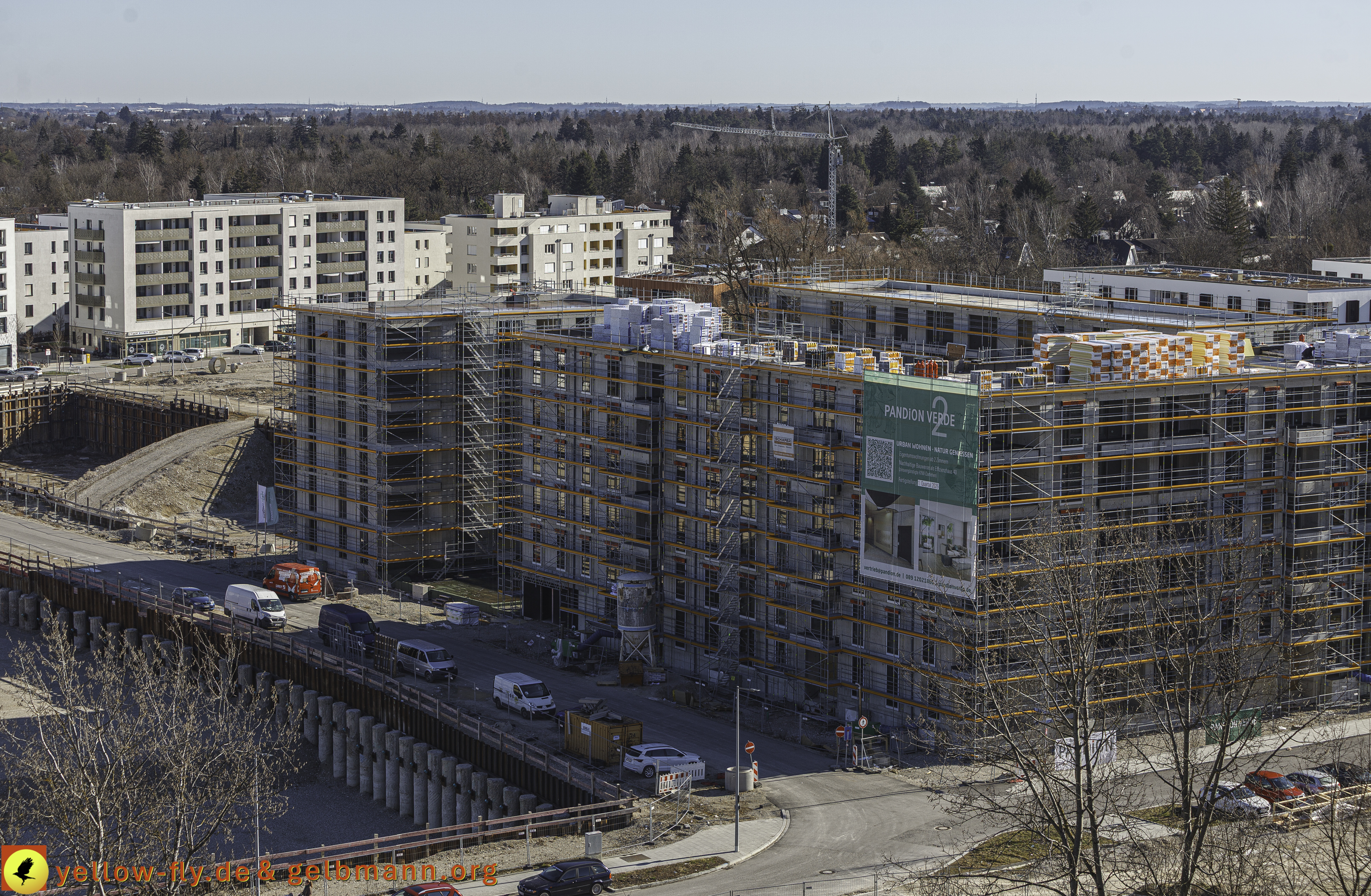 Es geht weiter auf der DEMOS-Baustelle und BayernHeim-Baustelle Alexisquartier und Pandion-Verde in Neuperlach. Es werden Fenster in den Rohbauten von Pandion Verde eingebaut. In beiden Baugruben tut sich nichts. Stillstand!