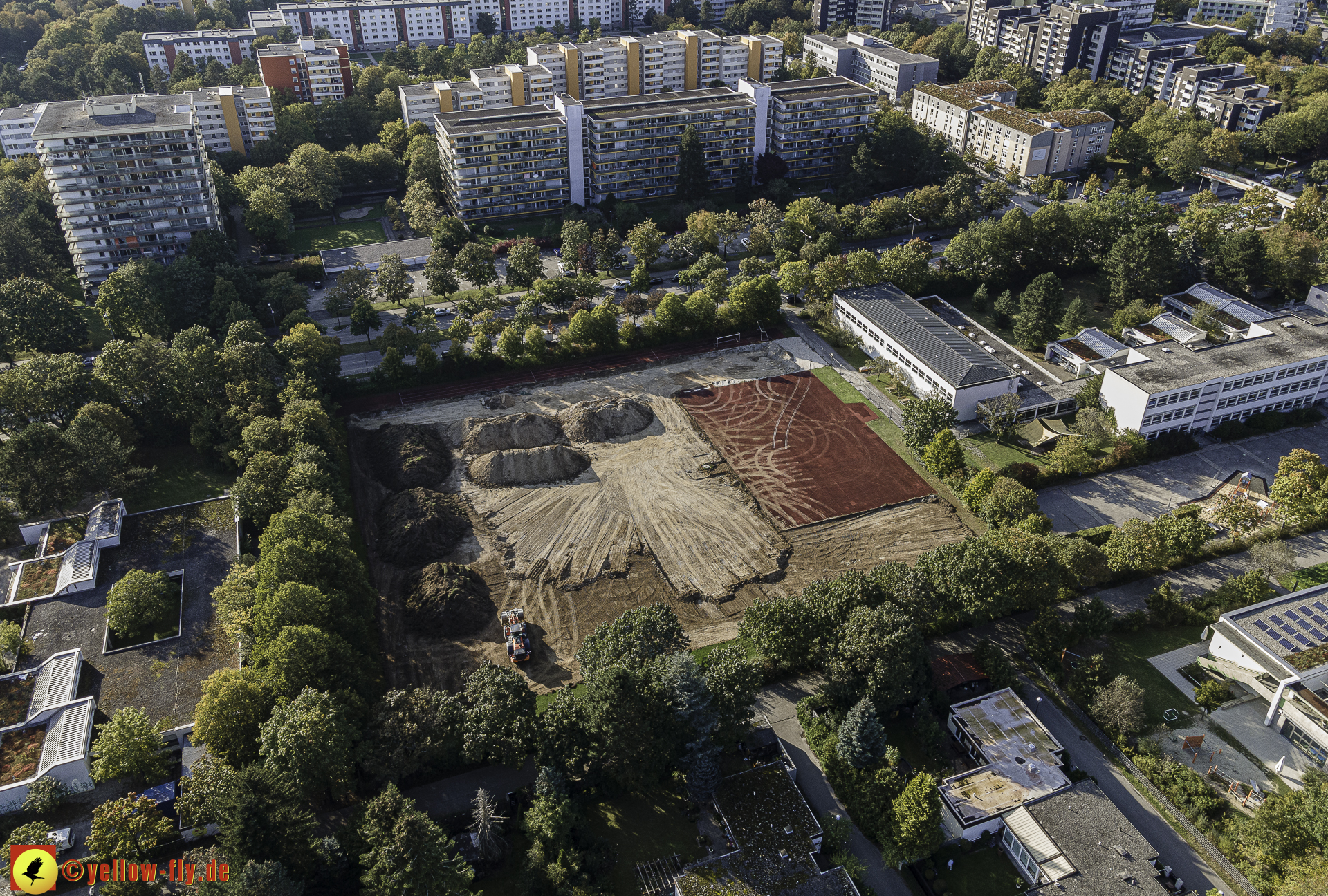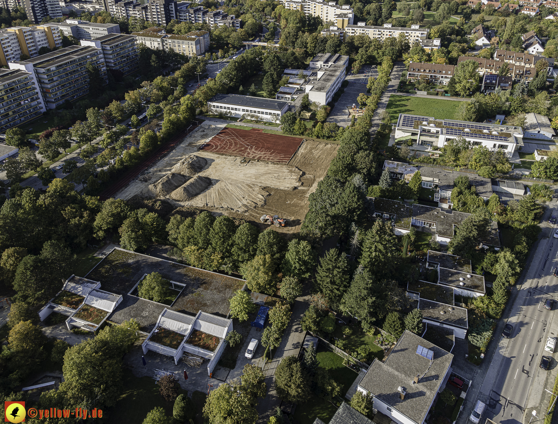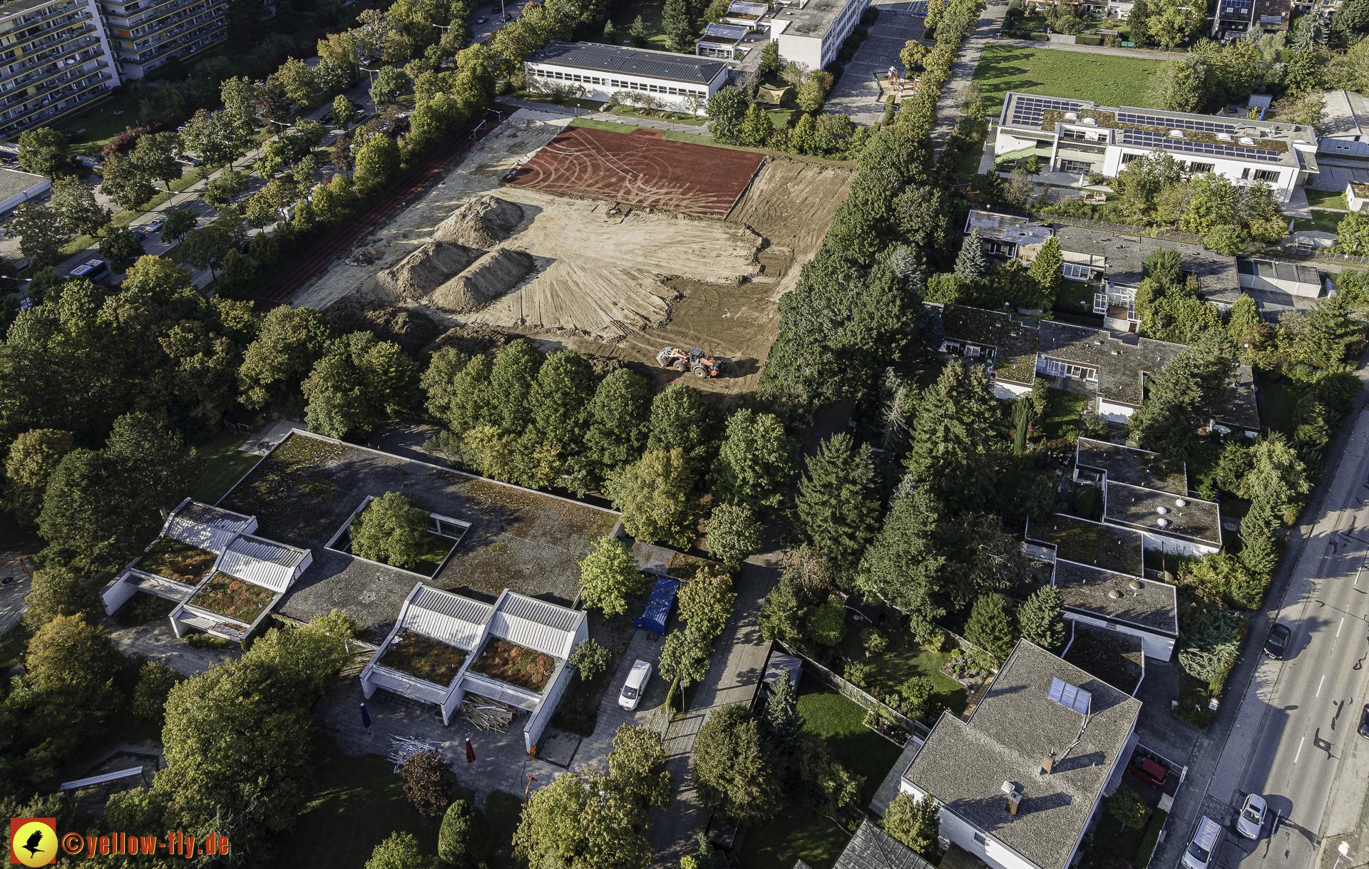 Bagger und Radlader sind dabei, den roten Belag der Sportanlage auf einen Haufen zusammenzutragen.