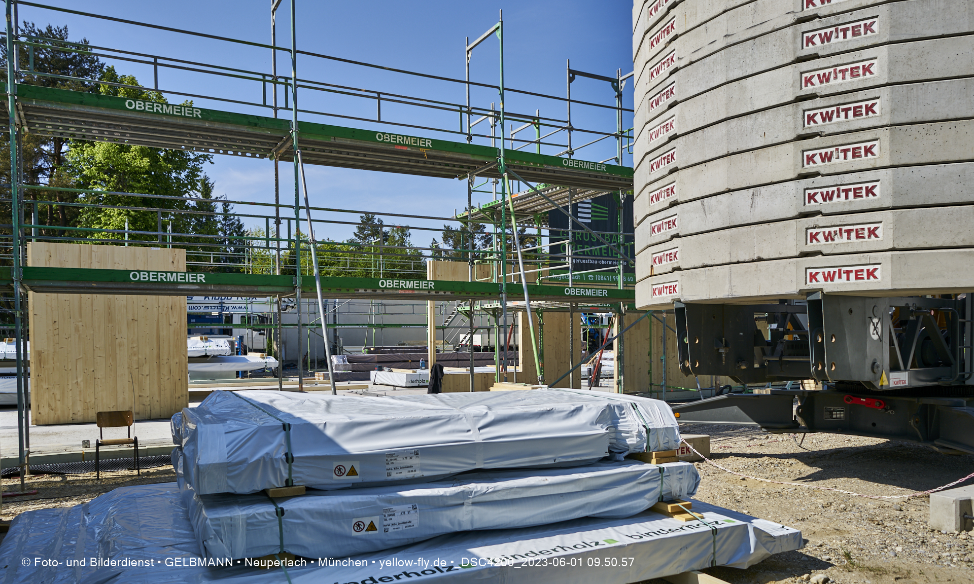 Daher ist auch schon das Gerüst aufgestellt worden, damit die Wandelemente von außen miteinander verbunden werden können.