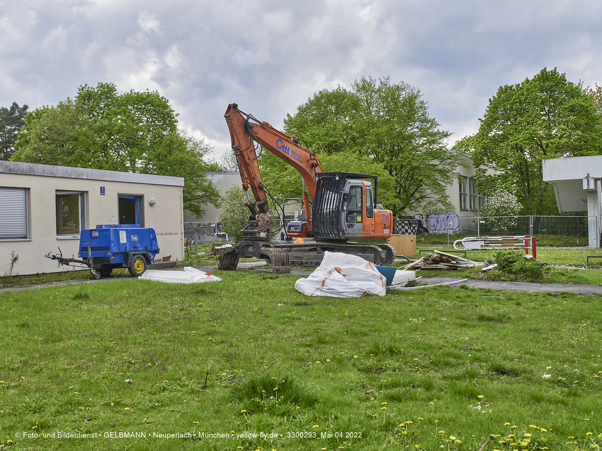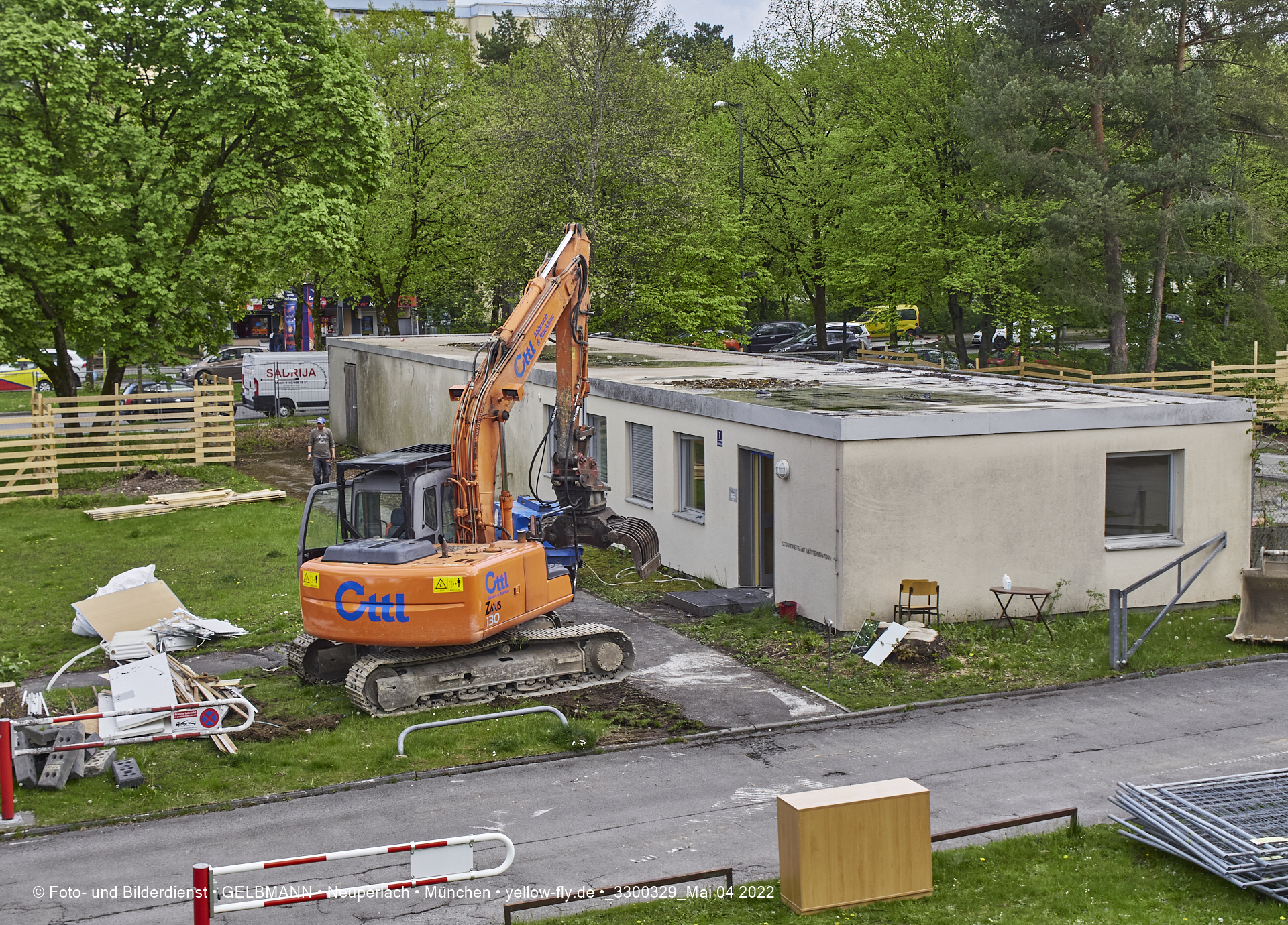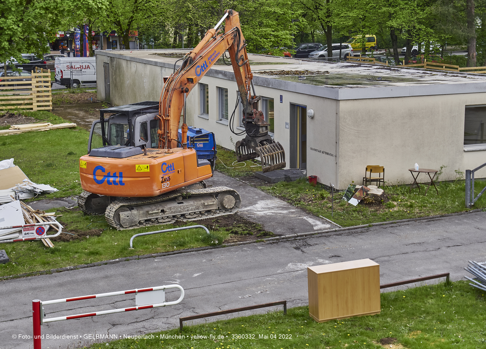 Immer mehr schwerses Baugerät und andere Vorbereitungen für den Abriss der Mütterberatungs-Baracke, sind zu beobachten. Weiter Vorbereitungen für den Abriss des Flachbaus der Mütterberatung in Neuperlach werden getroffen.
