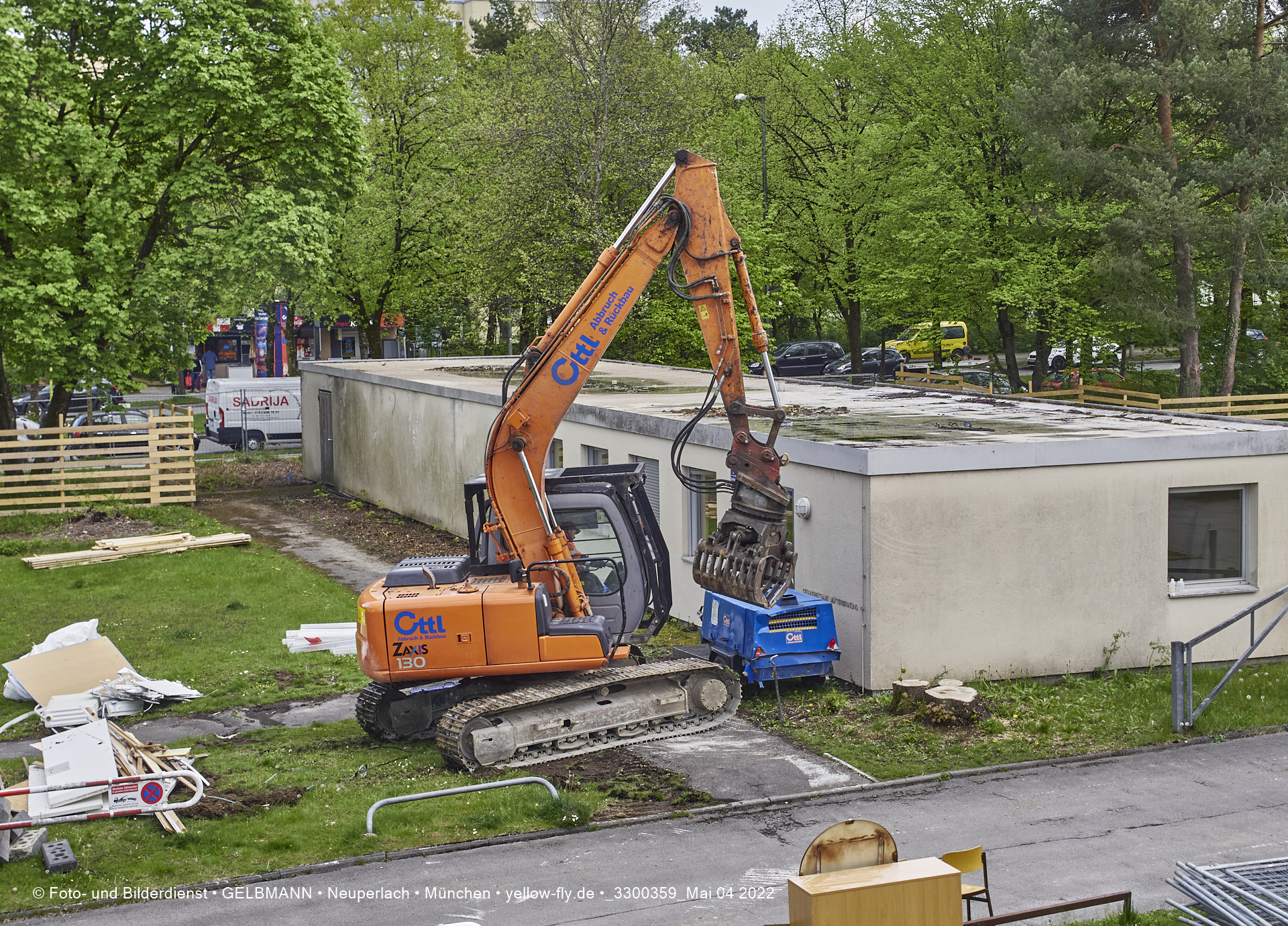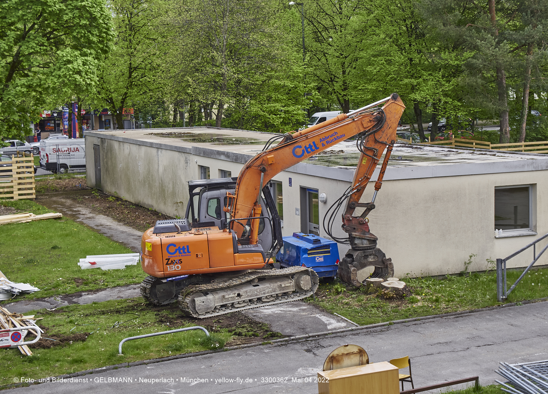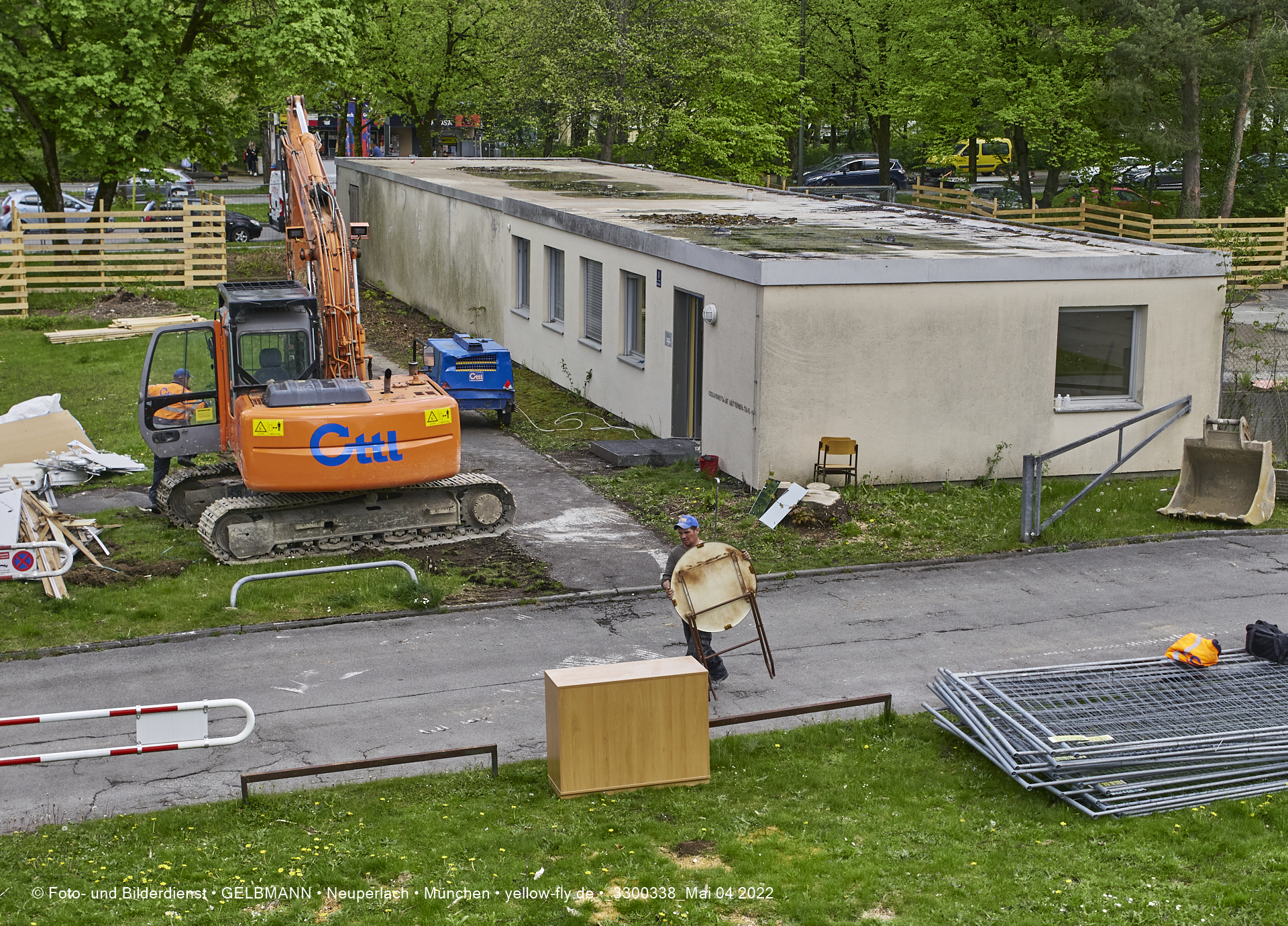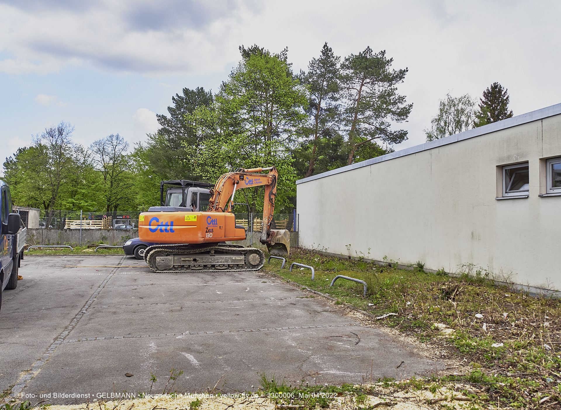 Immer mehr schwerses Baugerät und andere Vorbereitungen für den Abriss der Mütterberatungs-Baracke, sind zu beobachten. Weiter Vorbereitungen für den Abriss des Flachbaus der Mütterberatung in Neuperlach werden getroffen.