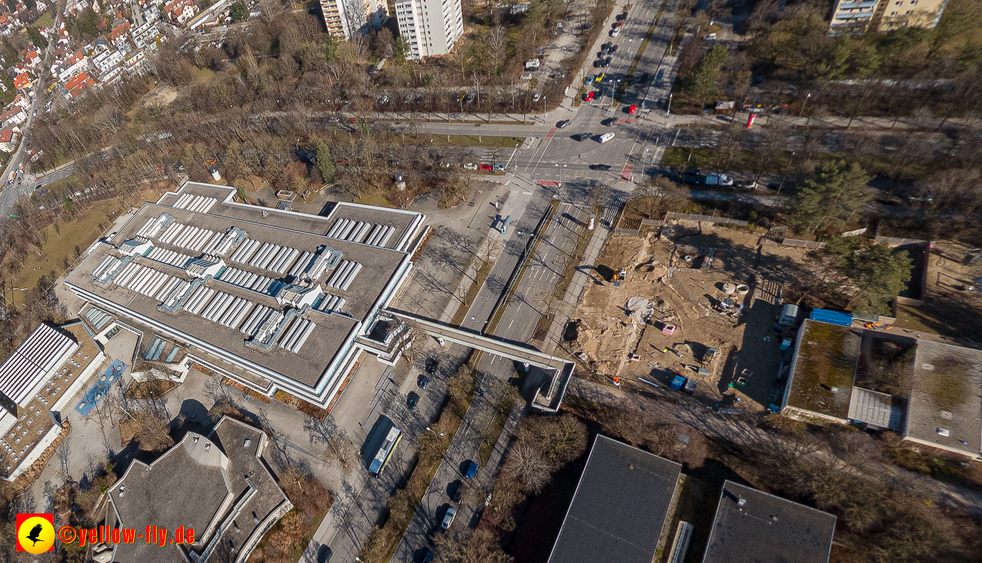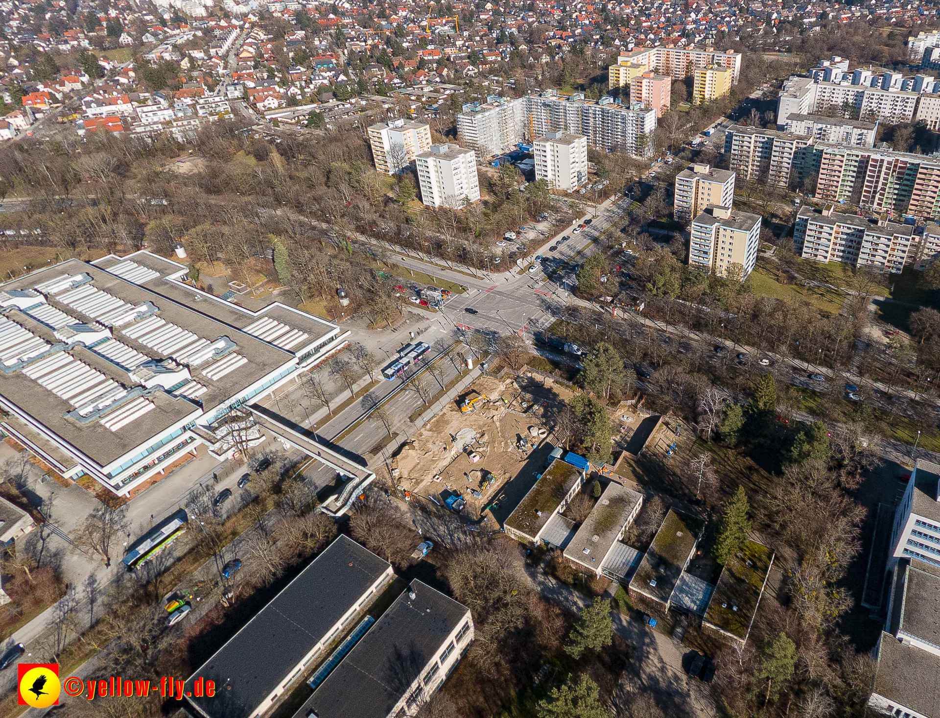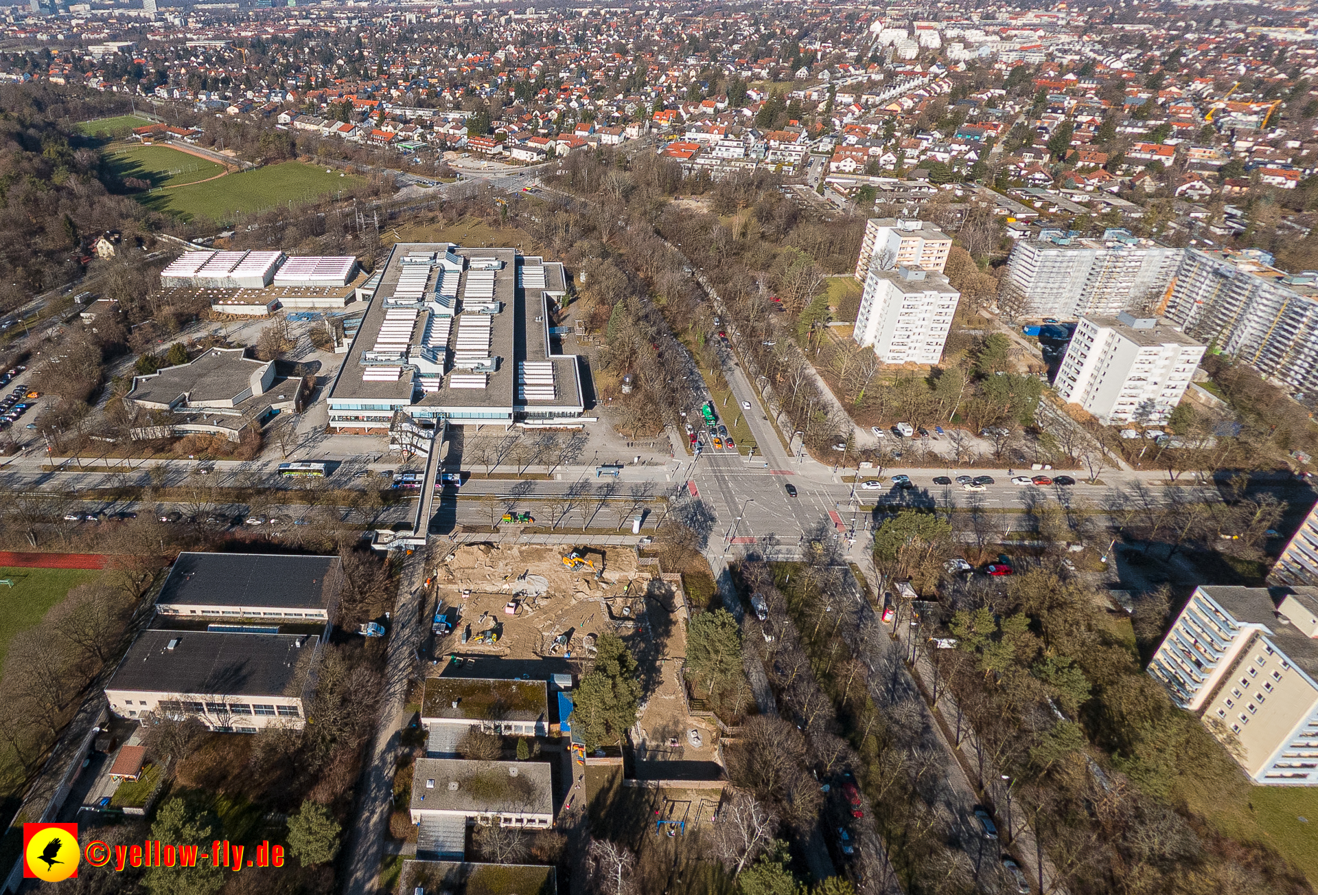 Aktuelle Luftbilder von der Baustelle „Haus für Kinder mit Hort und Elternberatungsstelle“ in der Quiddestraße 3. Die großen Veränderungen auf der Baustelle, sind nur aus der Luft zu erkennen. Umfangreiche Verlegungen von Versorgungsrohre sind zu sehen. Es geht zügig voran.