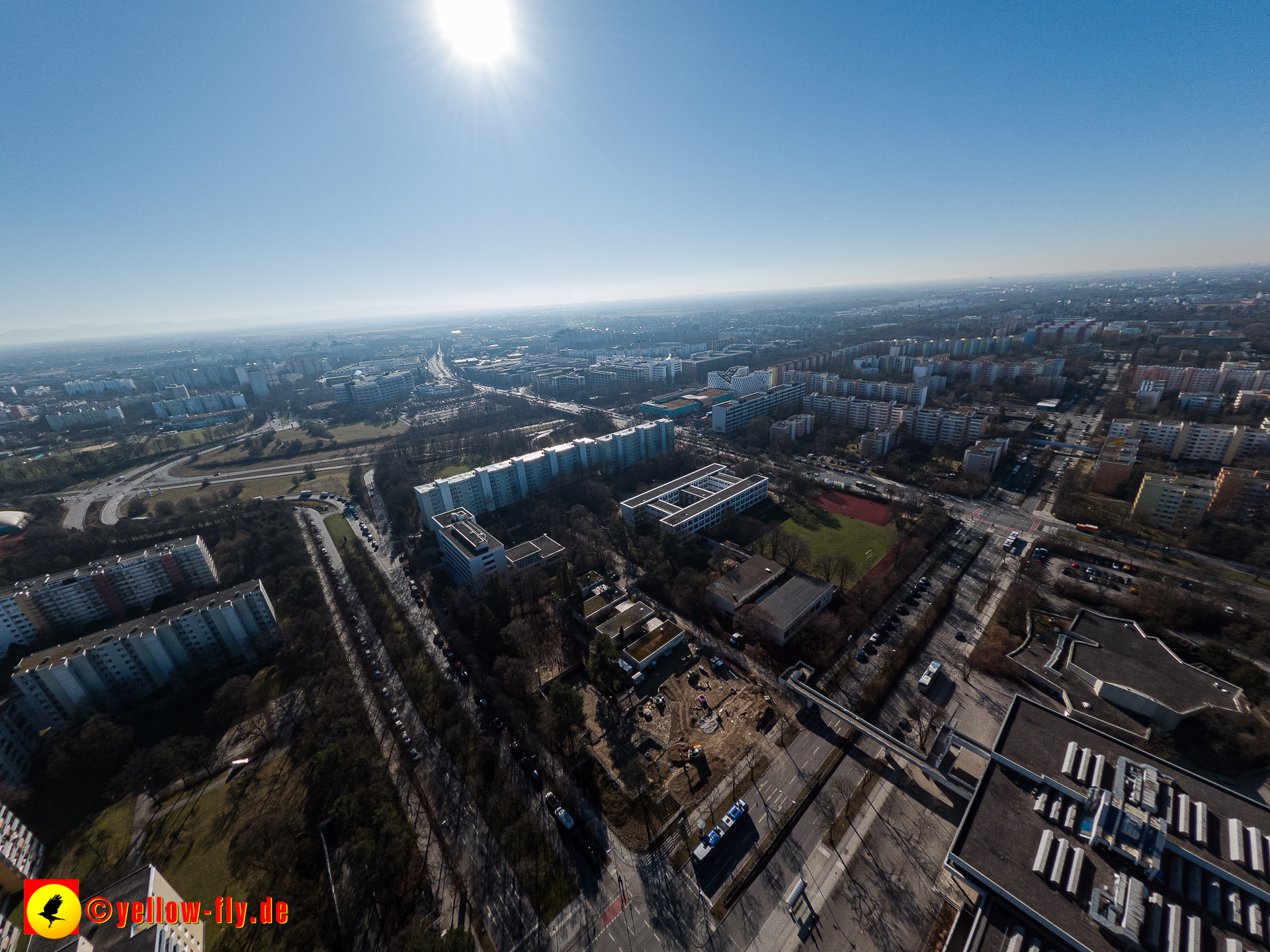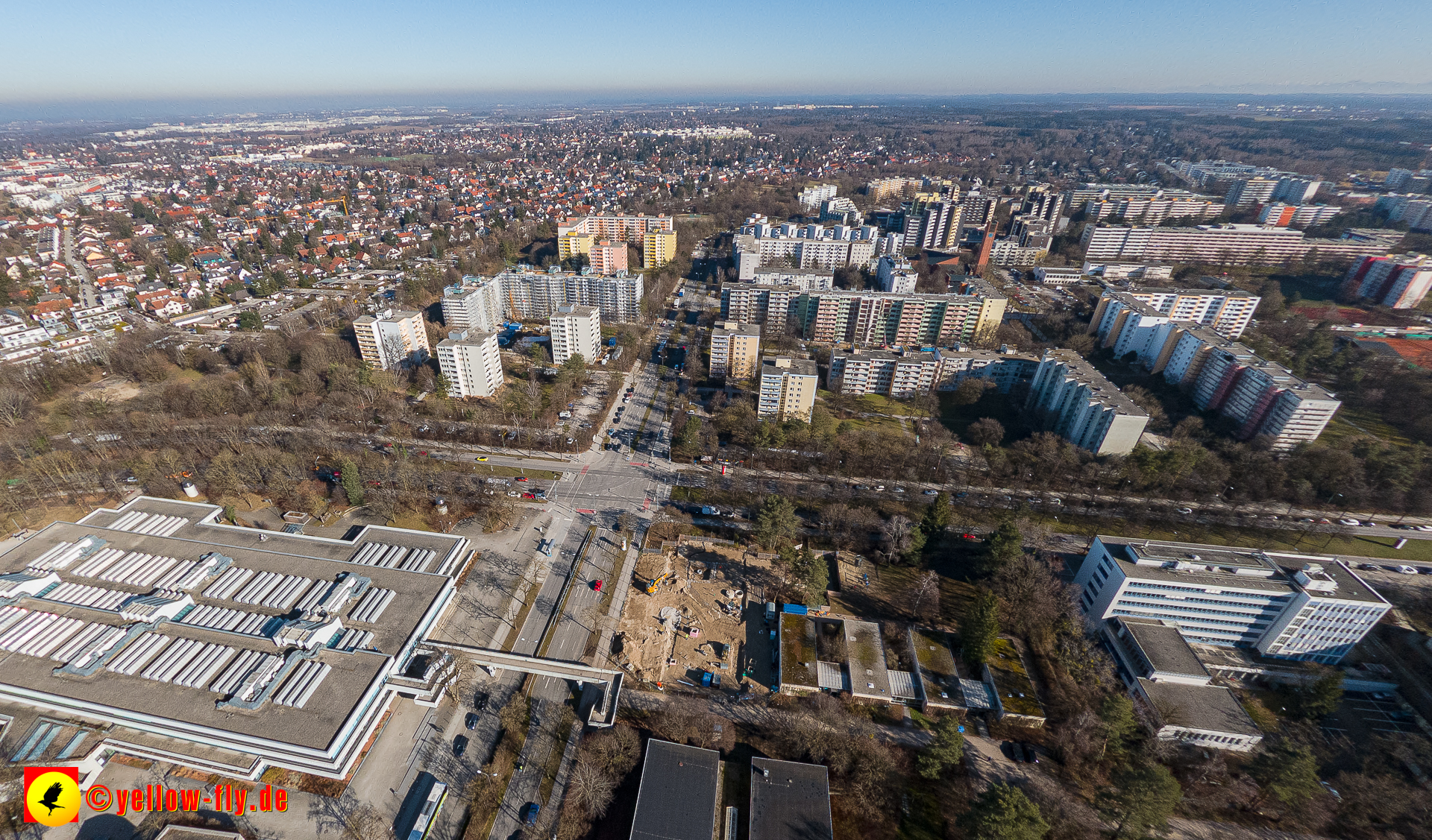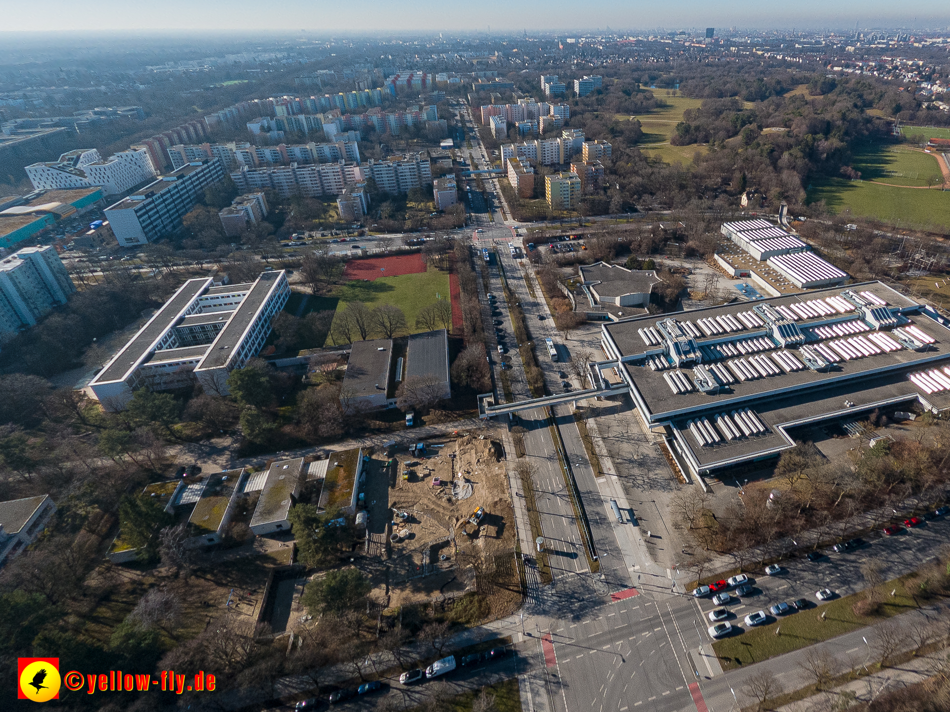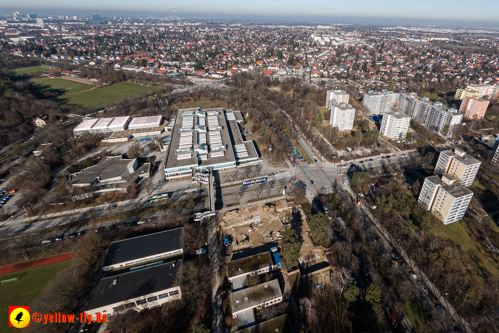 Aktuelle Luftbilder von der Baustelle „Haus für Kinder mit Hort und Elternberatungsstelle“ in der Quiddestraße 3. Die großen Veränderungen auf der Baustelle, sind nur aus der Luft zu erkennen. Umfangreiche Verlegungen von Versorgungsrohre sind zu sehen. Es geht zügig voran.