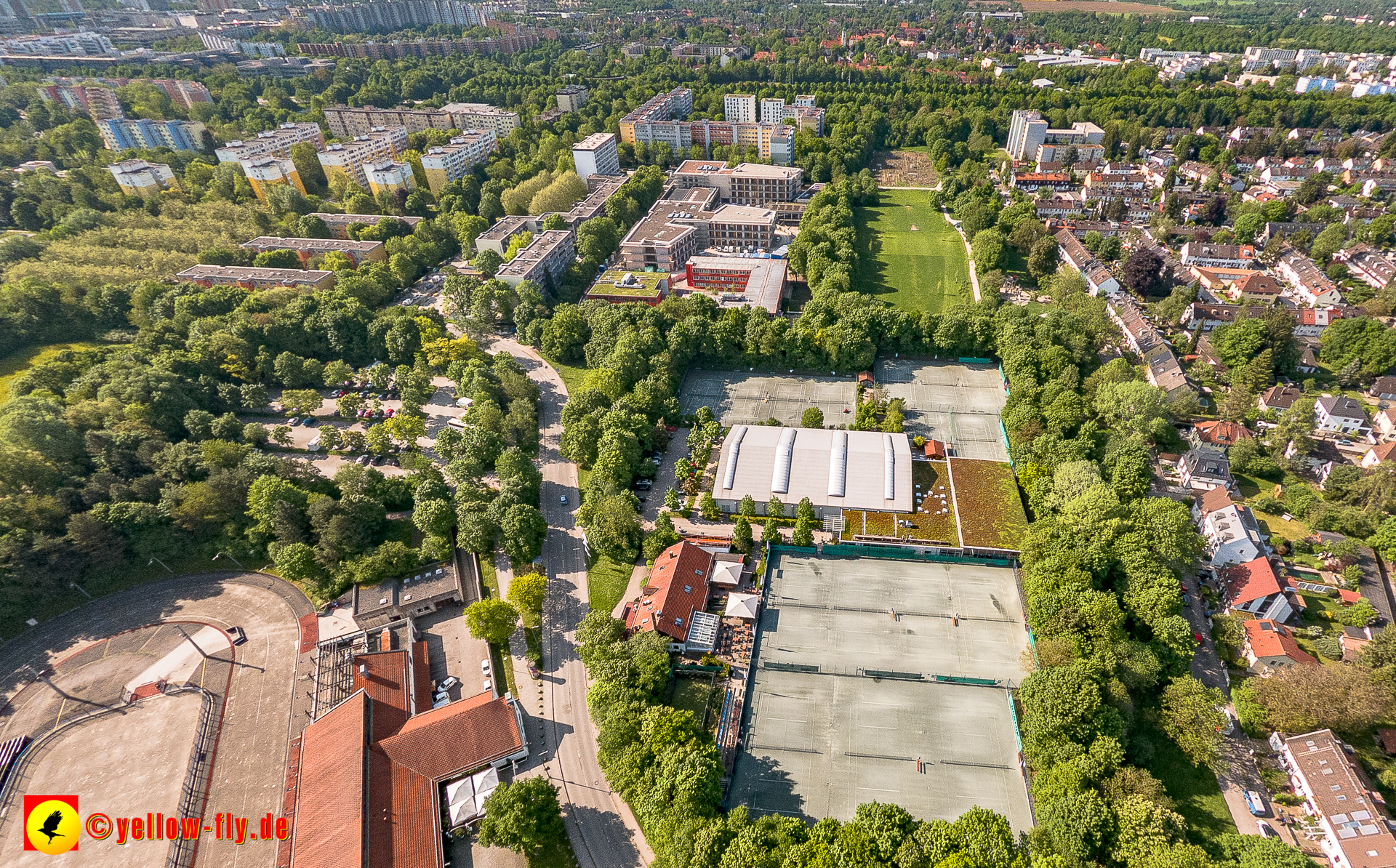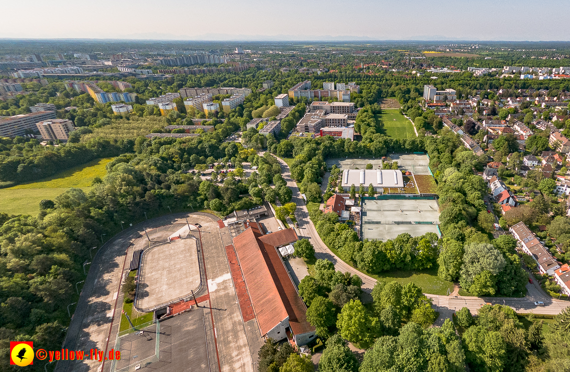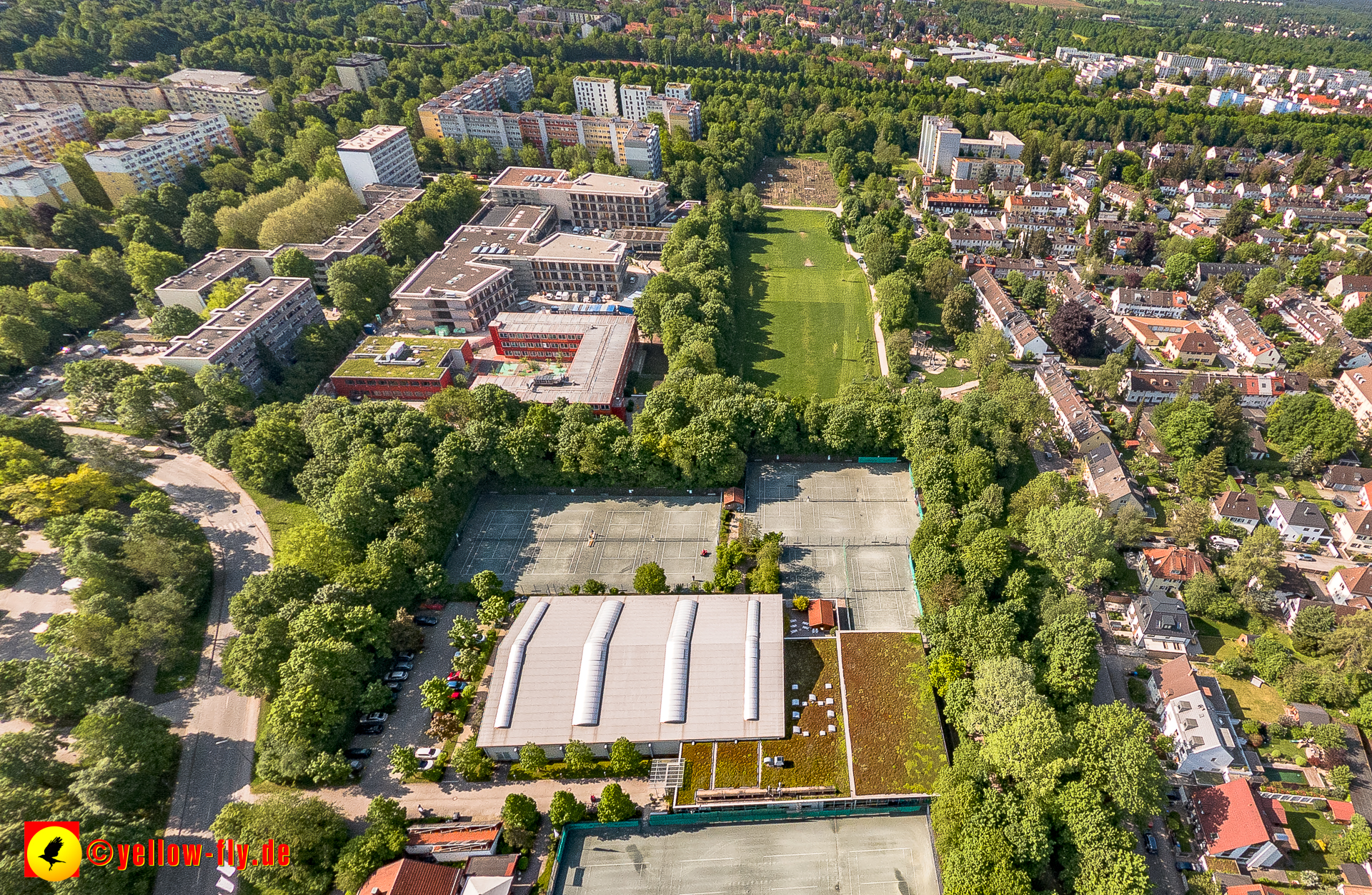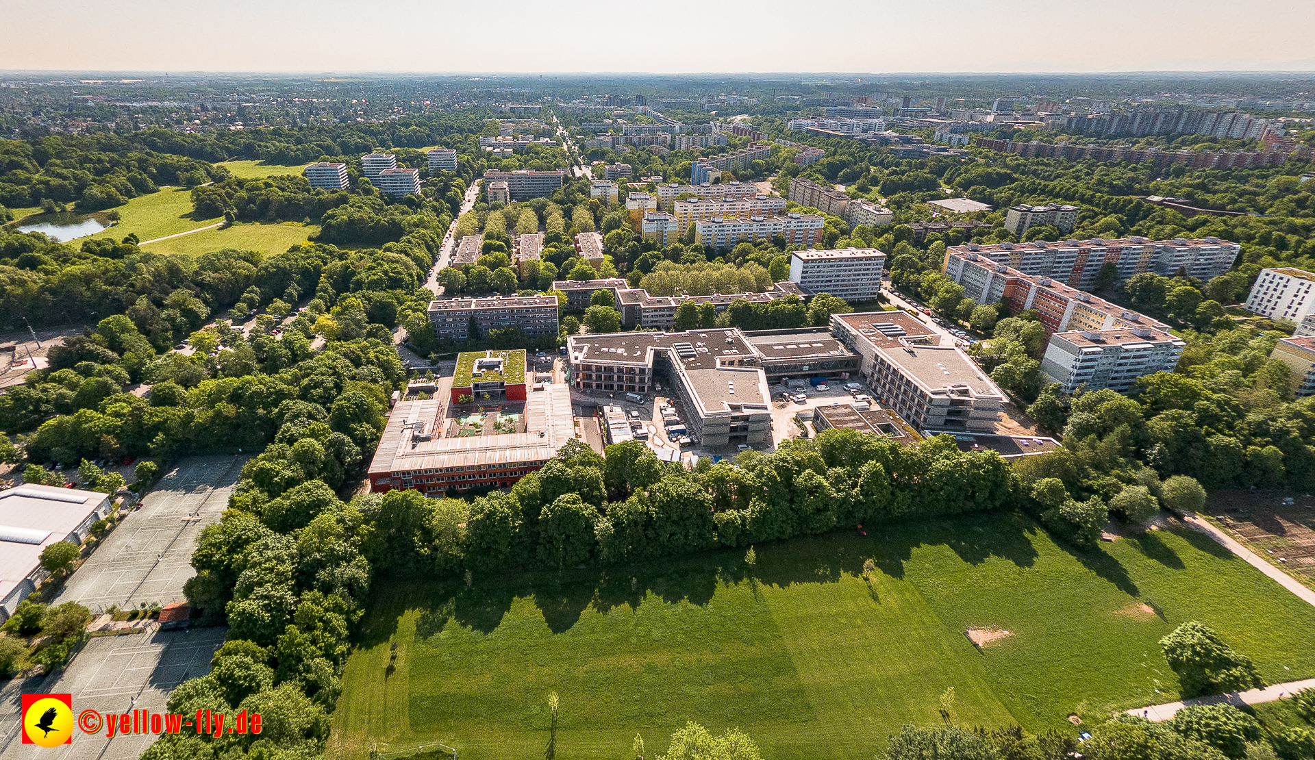 Mein Blick von Oben geht zu unserer neuen Schule am Strehleranger in Neuperlach, Nähe Ostpark. Täglich verändert sich die Optik. Fast fertig könnte man meinen. Auf den Dächern ist noch Baumaterial zu sehen, welches auch bald verschwunden sein wird. Im Hof der Schule stehen noch blaue Baucontainer. Also ganz fertig ist der Neu- un dUmbau noch nicht.